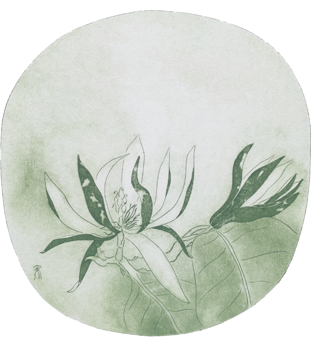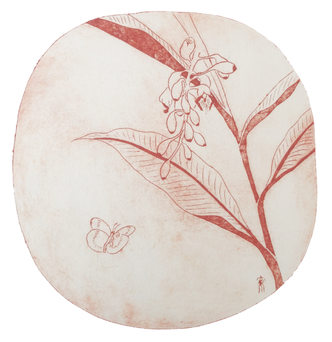 En apprenant les différentes techniques de l’estampe, I-An a progressivement découvert les lignes semblables à celles d’un dessin traditionnel « Bai Miao »*2, puis, les textures et les effets de flou de l’encrage et l’essuyage. L’ensemble crée une matière douce et profonde, les lignes n’étant pas tracées au pinceau mais gravées, elles ajoutent à l’estampe une simplicité charmante. S’inspirant des peintures « Xiao Pin »*3 de la dynastie Song, elle utilise la gravure pour recréer les fleurs qu’elle a vues ou désirées dans sa vie. Elle apprend des anciens comment s’asseoir tranquillement et reposer son âme dans ce coin de nature.